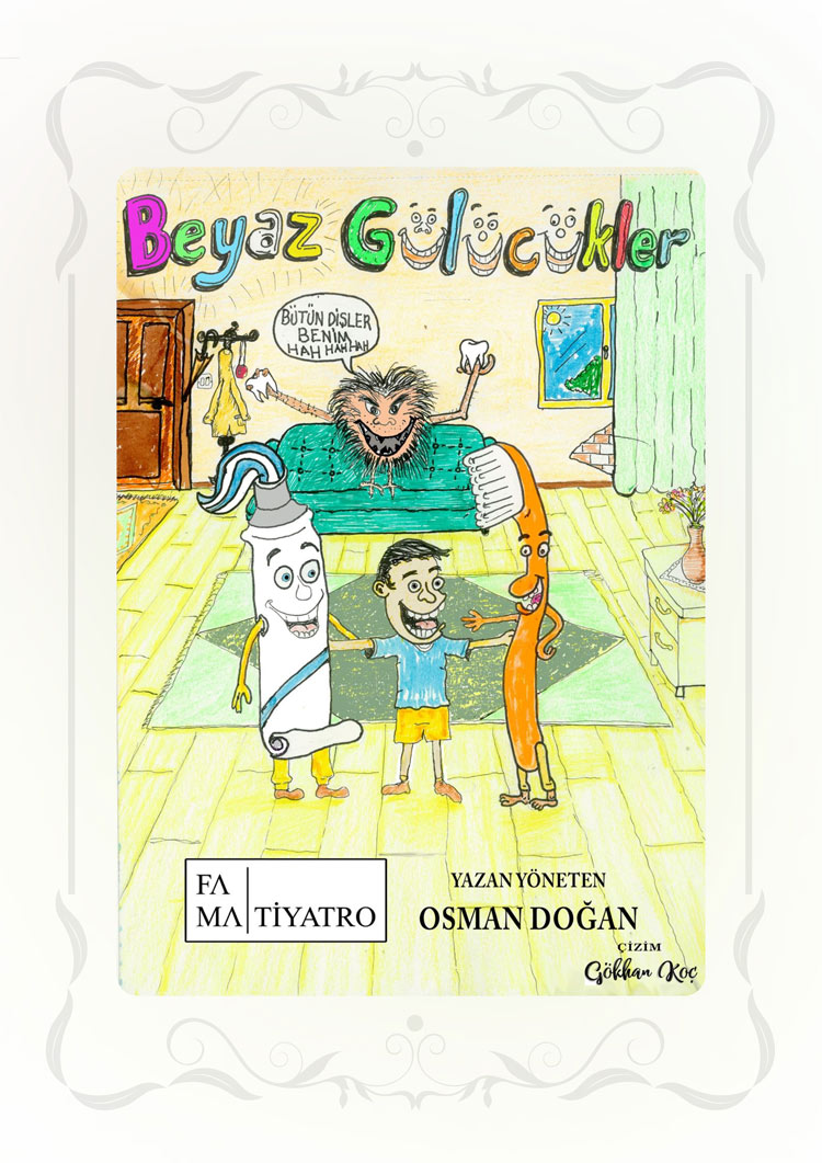 Beyaz Gülücükler Tema BaşlığıAğız ve Diş Sağlığı, Sağlıklı Beslenme Oyun Adı Beyaz GülücüklerYazar Osman DoğanYaş Grubu 4-11 YaşSüre 30 dk Karakterler Çocuk 1Çocuk 2BabaBakteriDiş FırçasıDiş Macunn Kısa Konu Özeti Sağlıklı beslenmekten kaçınan bir çocuğun dişi ağrımaya başlar. Doktordan ve dişçiden korktuğu için uyumaya karar verir. Rüyasında bakteri, diş fırçası ve diş macunu ile karşılaşır. Bakterinin aslında dost değil, düşman olduğunu öğrenir. Diş sağlığının ve beslenmenin önemini fark eden çocuk, dişçiden korkmadan kontrole gitmeye karar verir. Hedeflenen Pedagojik Kazanımlar Ağız ve diş sağlığının önemi konusunda bilinç kazanma Sağlıklı ve dengeli beslenme alışkanlıklarını tanıma Hijyen alışkanlıkları hakkında farkındalık geliştirme