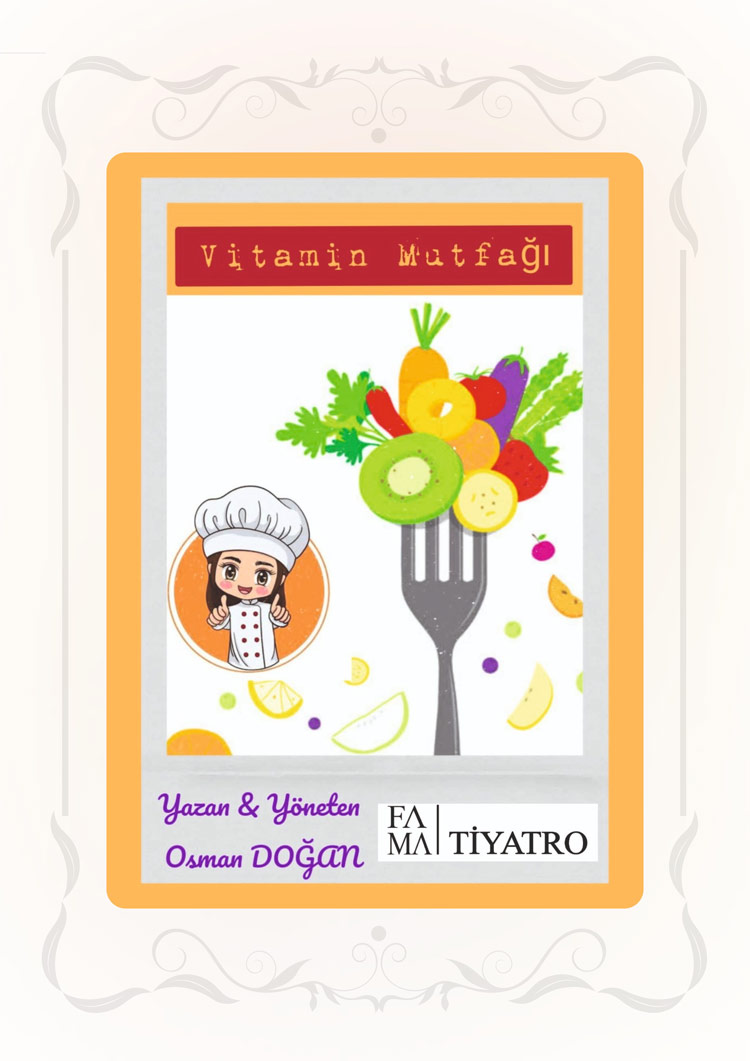 Vitamin Mutfağı Tema BaşlığıSağlıklı Beslenme, Hijyen, Sorumluluk, Etkileşimli Oyun Adı Vitamin MutfağıYazar Osman DoğanYaş Grubu 4-11 YaşSüre 30 dk Karakterler KralPrenses MiyaAşçıMikropHavuçPatlicanBrokoli Biber (Seyirciler baharat karakterleriyle katılır) Kısa Konu Özeti Prenses Miya yıkanmamış meyveleri yiyince hastalanır. Aşçı onu iyileştirmek için üç gün içinde bir çözüm bulmak zorundadır. Bu süreçte sebzeler ve seyirci desteğiyle özel bir vitamin çorbası hazırlanır. Prenses iyileşir, mikrop yenilir ve tüm ülkeye sağlıklı yaşamın önemi anlatılır. Hedeflenen Pedagojik Kazanımlar Sağlıklı ve hijyenik beslenmenin önemi Sebzeler ve vitaminler hakkında temel bilgiler Mikrop ve hastalık kavramlarının eğlenceli şekilde anlatımı Etkileşimli tiyatro ile çocukların sürece katılımı Sorumluluk, temizlik ve paylaşım değerleriyle tanışma